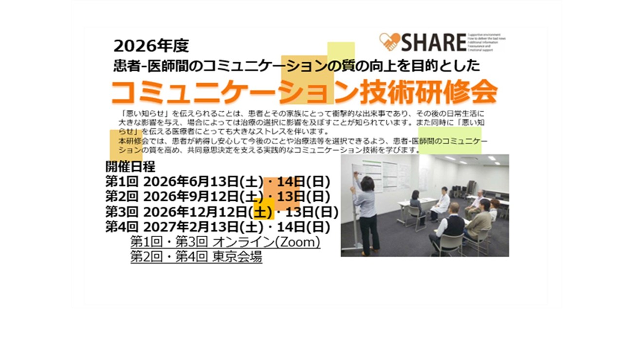 2026.03.18 イベント 2026年度コミュニケーション技術研修会(CST)のご案内 がん医療における患者さんと医療者の対話力向上を目的とした コミュニケーション技術研修会(CST) を開催いたします。 【2026年度の開催予定】 第1回SHARE-CST・AYA-CST合同開催(WEB開催) …
